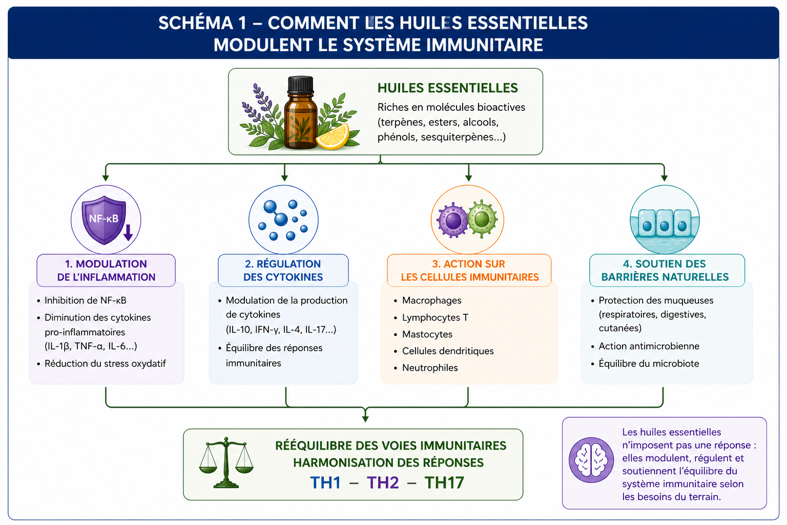 Ce schéma illustre les principaux niveaux d’action des huiles essentielles, depuis la régulation de l’inflammation jusqu’au soutien des barrières naturelles.