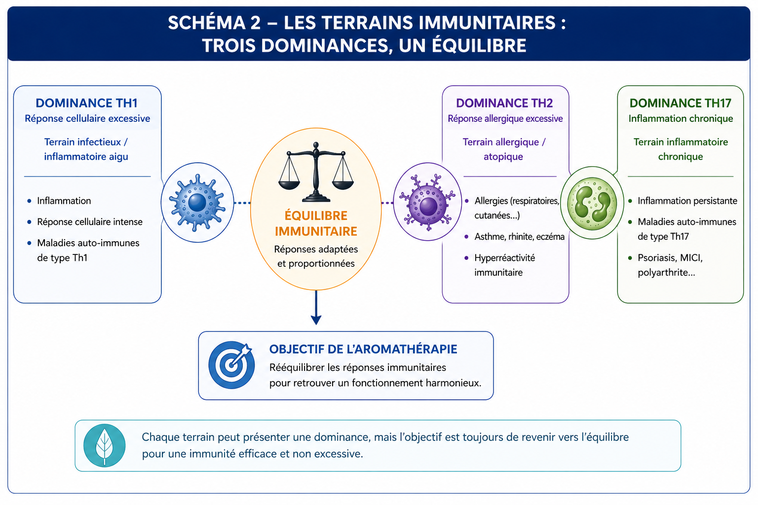Le tableau suivant propose une lecture pratique des principaux terrains rencontrés en aromathérapie et des orientations possibles en fonction du profil immunitaire.
