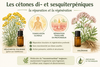 Contrairement à leurs cousines monoterpéniques, les cétones di- et sesquiterpéniques présentent un risque neurotoxique nettement moindre que les cétones monoterpéniques aux doses usuelles. Elles permettent donc de bénéficier d'une action régénératrice puissante, exercée avec beaucoup plus de subtilité et de sécurité. On y retrouve par exemple l'italidione, la curzérénone, la vétivérone, l'atlantone.