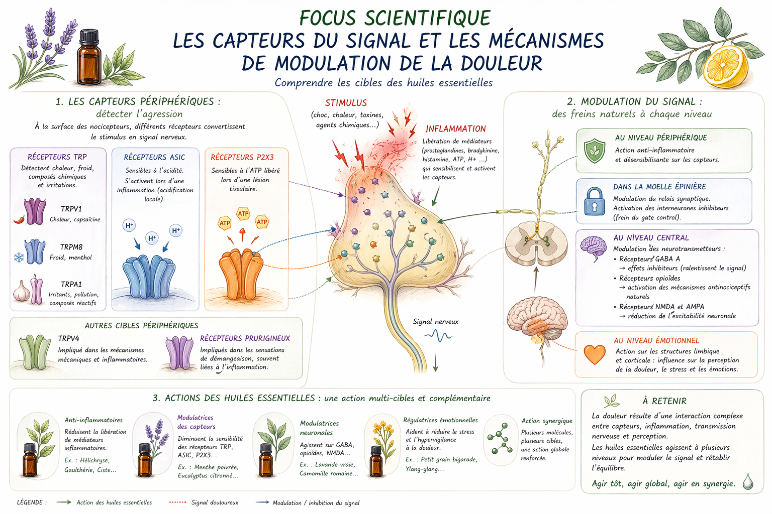 Pour découvrir comment utiliser ces molécules concrètement dans votre quotidien, retrouvez l'article : Comprendre les mécanismes de la douleur et l’action des huiles essentielles