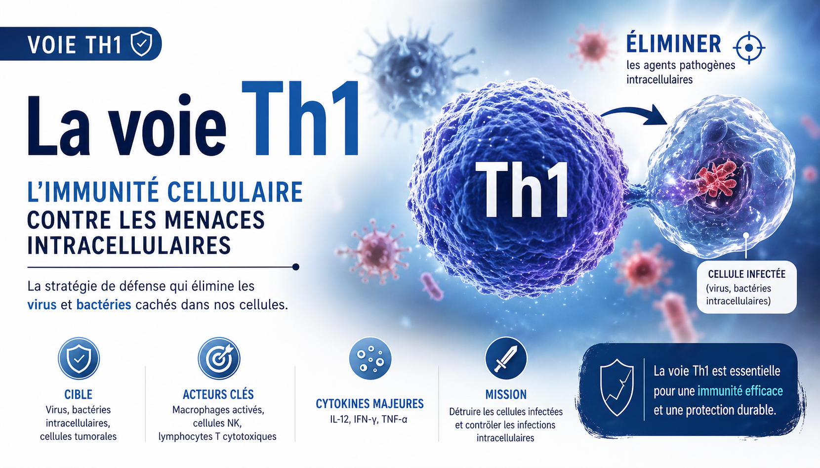Parmi elles, la voie Th1 occupe une place centrale. Elle correspond à une réponse immunitaire orientée vers l’immunité cellulaire, particulièrement efficace contre les agents pathogènes qui vivent à l’intérieur des cellules, comme certains virus ou certaines bactéries.